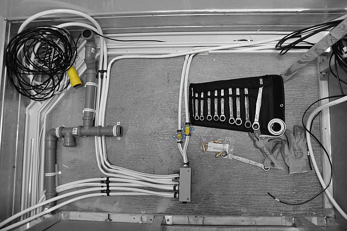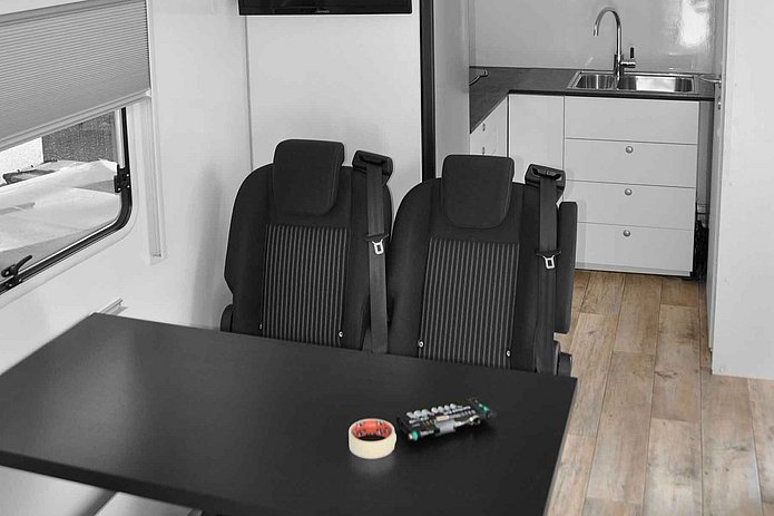 Over 150 meters of cable have already been laid and are waiting for professional connection to batteries and control devices. The first windows have been installed, two seats placed inside, and the kitchen gives the impression that we will soon be able to heat up some ravioli.