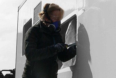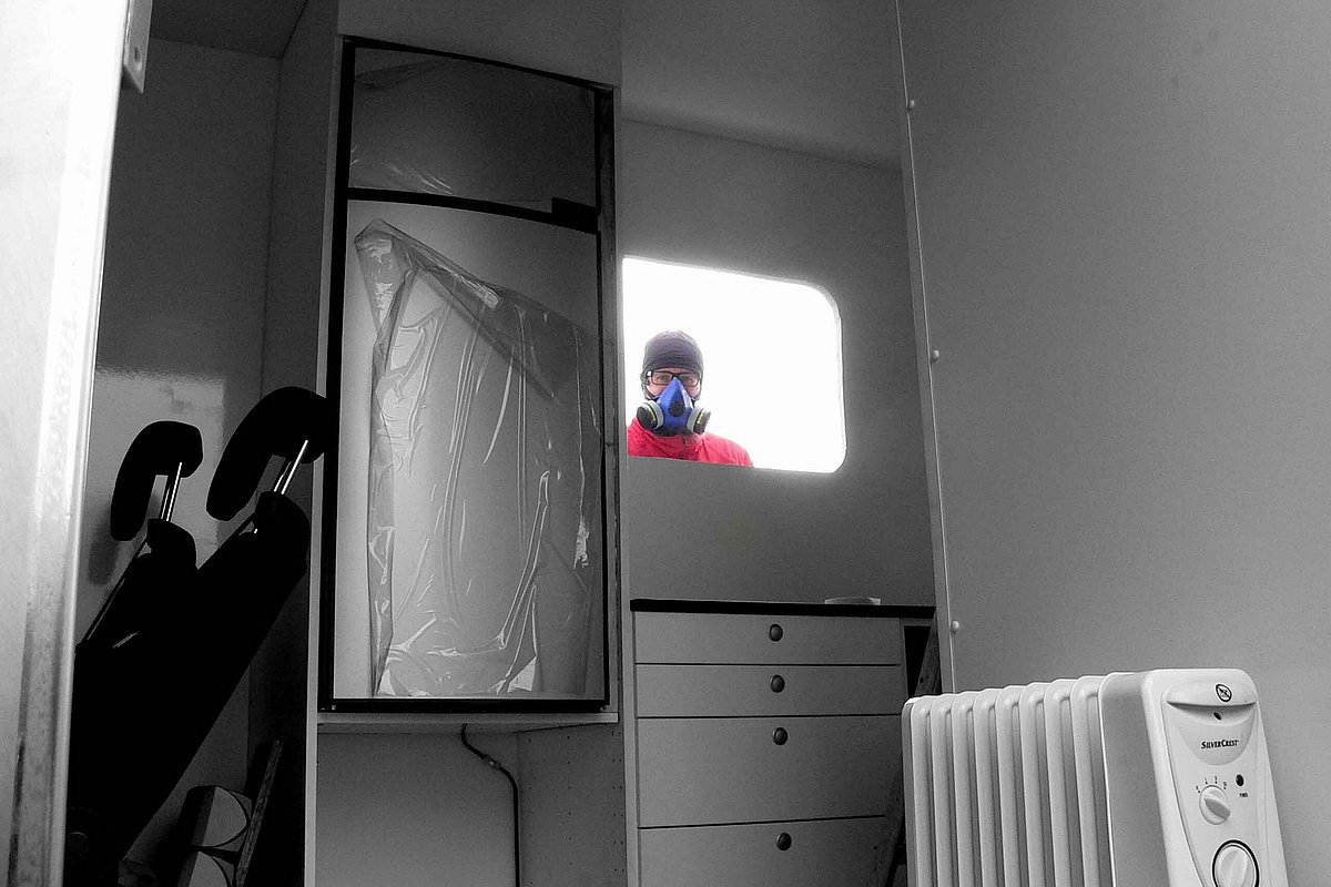 Actually, everything had gone pretty smoothly so far. But there were also moments when things really caught up with us in a bad way. The worst experience so far was discovering that the GFK interior walls had osmotic damage in several places. This is a scenario more commonly known in boat building and required seven days of sanding, plus a week of filling, priming, and painting. Another shock was waking up the morning after professionally laying designer flooring, only to find the entire floor had detached.