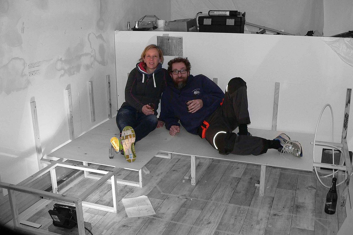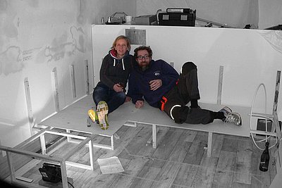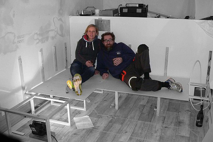 Let’s take stock as of March 2016: Interior walls refurbished, partitions and bed platform installed, heating 80% complete. The first furniture was needed. We had two go-to places that we visited frequently: One was a Swedish furniture store that sells furniture in a disassembled state. This was a big advantage for us due to necessary modifications. The other was our nearest hardware store, where we found laminated wood profiles and thin multiplex boards, providing a delicate, relatively lightweight yet stable construction base for the seating furniture.