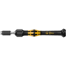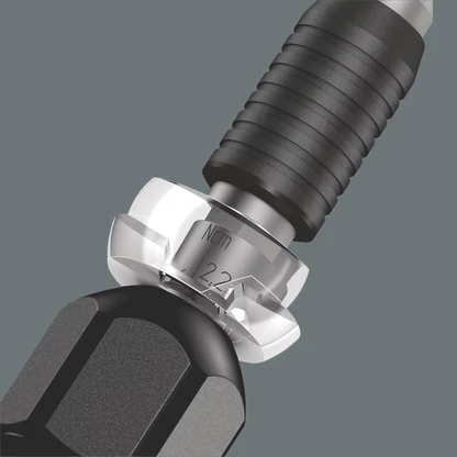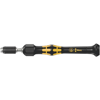 Torque tool with adjustable torque of 2.0 to 6.0 cNm (accuracy ± 10%). Compact handle/interchangeable blade system for torque controlled precision screwdriving. The Kraftform Micro ESD torque screwdriver is ideal for torque controlled jobs on electrostatically-susceptible components. Suitable for the take-up of bits with 4 mm halfmoon drive (Wera series 9) and 4 mm HIOS drive (Wera series 21). Tamperproof. Distinct audible and perceivable excess load signal when the pre-set torque value is reached. Unlimited manual loosening torque. Electrical surface resistance of ≤ 109 Ohm for secure protection against electrostatic charge. Manufactured in accordance with DIN EN 61340-5-1. Handle/Interchangeable blade system for rapid blade change. Kaftform Micro handle with twist cap and free-turning zone for rapid twisting, making any time-consuming repositioning of the fingers unnecessary. Power zone with integrated soft zones for the transfer of higher tightening and loosening torque. Precision zone directly above the blade for the right angle for adjustment work. Rapid fixing of the bit: just push the bit into the insert for automatic locking and a secure fit. To change the bit, simply push the sleeve forward and remove. Free-turning sleeve for simple guidance of the tool during the screwdriving process. Bits suitable for manual as well as power tool operations with electric screwdrivers (e.g. HIOS, Delvo, Sehan). Applications for example on smartphones, cell phones, cameras, electrical appliances, in dental labs and dental surgeries.