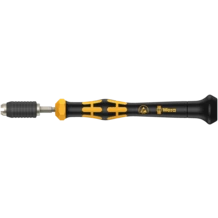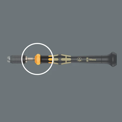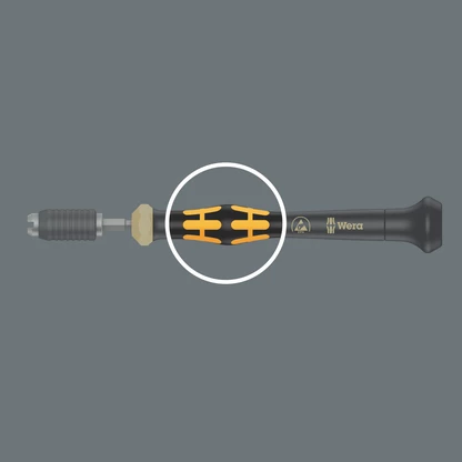 With a factory pre-set torque value set to the smallest scale value. For all applications, where the same constant torque and repeat accuracy are required. Compact handle/interchangeable blades system for torque-controlled precision screwdriving. The Kraftform Micro ESD torque screwdriver is ideal for torque-controlled jobs on electrostatically sensitive components. Suitable for bits with a 4 mm Halfmoon drive (Wera series 9) and a 4 mm HIOS drive (Wera series 21). Tamper-proof. Clearly audible and tactile signal when the set torque is reached. Repeatability is 100% guaranteed. Unlimited manual loosening torque. Electrical surface resistance ≤ 109 ohms for safe protection against electrostatic charge. Manufactured as per DIN EN 61340-5-1. Handle/interchangeable blades system for rapid blade changes. Kraftform Micro handle with rotating cap and free-turning zone for rapid turning, making any time-consuming repositioning of the fingers unnecessary. Power zone with integrated soft zones ensures the transmission of high tightening and loosening torques. Precision zone directly above the blade for the correct rotation angle for adjustment work. Rapid bit fixing: Simply push the bit into the holder for automatic locking and a secure fit. To change the bit, simply push the sleeve forward and remove the bit. Free-running actuating sleeve for easy handling of the tool during the screwdriving process. Bits suitable for manual and machine operated screwdriving connections with electric screwdrivers (including HIOS, Delvo, Sehan). Use with e.g. smartphones, mobile phones, cameras, electronic devices, in dental laboratories and dental surgeries.