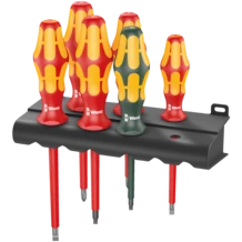 6-piece screwdriver set with individually tested, insulated screwdrivers as per IEC 60900. Individual testing in a water bath at 10,000 volts so as to ensure safe working at the permitted voltage of 1,000 volts. Kraftform Plus handle for pleasant, ergonomic working that makes blisters and calluses a thing of the past. Hard gripping zones for high working speeds whereas soft zones ensure high torque transfer. Partially Lasertip: the tip literally bites itself into the screw head and prevents any slipping. Take it easy Tool Finder: colour coding according to profile and size. The anti-roll feature prevents any bothersome rolling away at the workplace. Including a rack for storage.