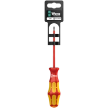 Wera VDE screwdrivers with multi-component Kraftform Plus handle for fast and low-fatigue working: hard gripping zones for high working speeds whereas soft zones ensure high torque transfer. Individually tested in water bath at 10,000 volts for secure work at the permissible voltage of 1,000 volts. Take it easy tool finder with colour coding according to profiles and size stamp - for simple and rapid accessing of the required tool. The hexagonal anti-roll feature prevents any bothersome rolling away at the workplace.