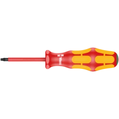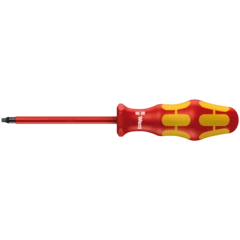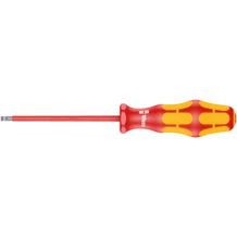 Wera VDE screwdriver with multi-component Kraftform Plus handle for fast and smooth work: Hard handle zones for high working speeds, while soft handle zones guarantee a high torque transfer. Individually tested at 10,000 V for safe working at the approved voltage of 1,000 V. Take it easy tool finder with colour coding by profile and size stamping - for quick and easy identification of the required tool. The hexagon anti-roll protection avoids screwdrivers from rolling away annoyingly at the workplace.