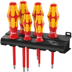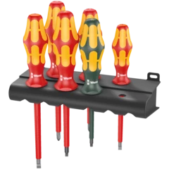 Reduced blade diameter with integrated protective insulation, low-lying screw and spring elements can be easily reached and operated. Kraftform Plus handle for comfortable ergonomic screwdriving, which avoids blisters and calluses. Hard handle zones for high working speeds, while soft handle zones guarantee a high torque transfer. Take it easy tool finder with colour coding by profile and size stamping - for quick and easy identification of the required tool . Anti-roll protection avoids bits from rolling away annoyingly at the workplace.