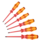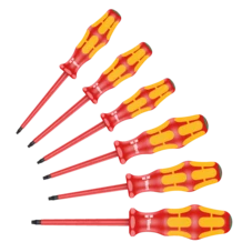 6-piece Wera VDE screwdriver set with Multi-component Kraftform Plus handle for fast and low-fatigue working: hard gripping zones for high working speeds whereas soft zones ensure high torque transfer. Individually tested in a water bath at 10,000 volts so as to ensure safe working at the permitted voltage of 1,000 volts. Take it easy Tool Finder: colour coding according to profile and size. The hexagonal anti-roll feature prevents any bothersome rolling away at the workplace.
