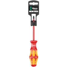 Wera VDE screwdrivers with multi-component Kraftform Plus handle for fast and low-fatigue working: hard gripping zones for high working speeds whereas soft zones ensure high torque transfer. Individually tested in water bath at 10,000 volts for secure work at the permissible voltage of 1,000 volts. The hexagonal anti-roll feature prevents any bothersome rolling away at the workplace.
