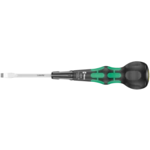 Screwdriver with Kraftform series 1800 handle for slotted screws. The handle fits perfectly in the hand. The convex shape allows the transmission of high torques. The soft handle zones ensure a good grip and low-loss power transmission. The hard handle zones allow a high power transmission, even when pressure is applied with the ball of the hand. The recesses at the upper end of the handle facilitate fine adjustment while screwdriving. Due to the narrow transition between handle and blade, even sunken screws in narrow areas can be easily reached. The anti-roll protection at the rear end of the handle hinders the tool from rolling away annoyingly at the workplace. The tips of Wera Lasertip screwdrivers are microscopically roughened with laser beams. This rough surface "bites" into the screw head which avoids unintentional slipping out of the screw.