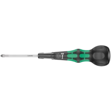 Screwdriver with Kraftform series 1800 handle for Pozidriv screws. The handle fits perfectly in the hand. The convex shape allows the transmission of high torques. The soft handle zones ensure a good grip and low-loss power transmission. The hard handle zones allow a high power transmission, even when pressure is applied with the ball of the hand. The recesses at the upper end of the handle facilitate fine adjustment while screwdriving. Due to the narrow transition between handle and blade, even sunken screws in narrow areas can be easily reached. The anti-roll protection at the rear end of the handle hinders the tool from rolling away annoyingly at the workplace. The tips of Wera Lasertip screwdrivers are microscopically roughened with laser beams. This rough surface "bites" into the screw head which avoids unintentional slipping out of the screw.