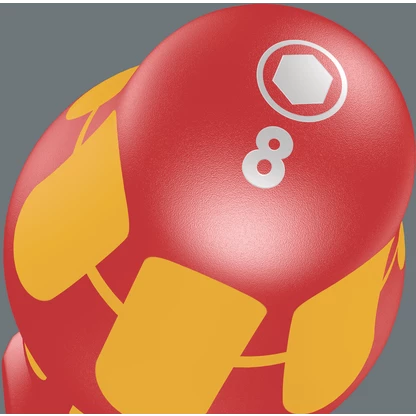 Wera produces the Kraftform handle out of several materials with different properties. A resistant plastic is used for the core which ensures that the blade is held securely even under high strain. A softer material is used for the coloured soft zones, which provides high frictional resistance and allows the transfer of high forces – resulting in less required screwdriving effort. The red sections with their hard surfaces prevent any “sticking” of the hand to the handle, making rapid repositioning of the hand possible.