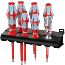High quality Kraftform Plus VDE screwdriver set out of stainless steel by Wera. The stainless tools from Wera are vacuum ice-hardened and have the hardness and strength needed for screw connections. They can be used for industrial application without hesitation. The individual testing of the Kraftform Stainless VDE screwdrivers in a water bath at 10,000 volts as per DIN EN 60900 (IEC 60900) ensures safe working with voltages of up to 1,000 volts. Secure working is also ensured under extreme conditions and verified with the proven cold impact resistance at -40° C. Mainly with Lasertip: the Lasertip tip literally bites into the screw head and prevents any slipping out of the screw recess. Multi-component Kraftform handle for fast and low-fatigue working. Take it easy Tool Finder: colour coding according to profile and size. The hexagonal anti-roll feature prevents any bothersome rolling away at the workplace. Includes a practical rack for tidy storage of the screwdrivers.
