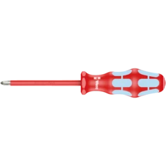 High quality Kraftform Plus VDE screwdriver out of stainless steel by Wera. The stainless tools from Wera are vacuum ice-hardened and have the hardness and strength needed for screw connections. They can be used for industrial application without hesitation. The individual testing of the Kraftform Stainless VDE screwdrivers at 10,000 volts as per DIN EN 60900 (IEC 60900) ensures safe working with voltages of up to 1,000 volts. Secure working is also ensured under extreme conditions and verified with the proven cold impact resistance at -40° C. Kraftform handle for fast and low-fatigue working. Take it easy Tool Finder: colour coding according to profile and size. The hexagonal anti-roll feature prevents any bothersome rolling away at the workplace.