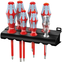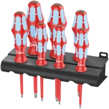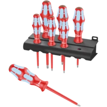 7-piece VDE screwdriver set made of stainless steel. Wera's stainless steel tools are vacuum ice tempered and therefore have the hardness and strength properties required for screw connections. Industrial use is possible without restrictions. Safe working at voltages up to 1,000 V is guaranteed by the Kraftform Stainless VDE screwdrivers individually tested at 10,000 V as per DIN EN 60900 (IEC 60900). The tested cold impact resistance at -40° C ensures safety even under extreme operating conditions. Multi-component Kraftform handle for fast and gentle work. Take it easy tool finder with colour coding by profile and size stamping - to help you find the required tool quickly and easily. The hexagon anti-roll protection avoids screwdrivers from rolling away annoyingly at the workplace.