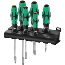 6-piece screwdriver set with Kraftform Plus handle for pleasant, ergonomic working that makes blisters and calluses a thing of the past. Hard gripping zones for high working speeds whereas soft zones ensure high torque transfer. The Lasertip tip literally bites into the head of the screw and thereby prevents any slipping. More torque can be transferred with the help of an open-end or ring spanner applied to the hexagonal blade and the integrated bolster. Take it easy Tool Finder: colour coding according to profile and size. The hexagonal anti-roll feature prevents any bothersome rolling away at the workplace. Including a practical rack for tidy storage of the screwdrivers.