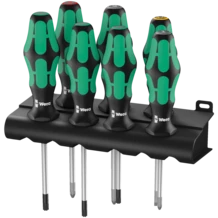7-piece screwdriver set with Kraftform handle for pleasant, ergonomic working that prevents blisters and calluses. The Lasertip tip literally bites into the head of the screw and thereby prevents any slipping out of the screw head. Take it easy Tool Finder: colour coding according to profile and size. The hexagonal anti-roll feature prevents any bothersome rolling away at the workplace. Includes a practical rack for tidy storage of the screwdrivers.