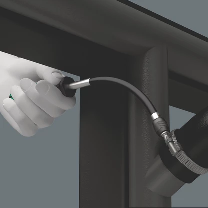 Screwdriving can also be achieved “around the corner” with the screwdriver 392. The flexible shaft allows unfavourably-positioned screw fastenings to be reached. The ideal tool for difficult-to-access screwdriving applications e.g. in the engine compartment of a car.