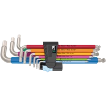 Premium L-key set made of stainless steel for imperial hexagonal socket screws by Wera. Stainless steel prevents transmission of extraneous rust. The Hex-Plus profile offers larger contact surfaces in the screw head. The notch effect is reduced to a minimum and the destruction of the screw head is almost eliminated. With hexagonal ball tip at the long arm: The ball-shaped tip profiles enable the tool shaft to be moved and pivoted relative to the screw axis which allows screwdriving "around the corner". Take it easy tool finder with colour coding by size. In an almost wear-free L-key clip.