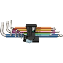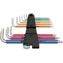 High quality L-key set out of stainless steel for hexagon socket screws by Wera. Stainless steel prevents the transfer of extraneous rust. The Hex-Plus profile offers a greater contact surface in the head of the screw. The notching effect is therefore reduced to a minimum and damage to the screw head more or less eliminated. Come with hex ballpoint on the long arm: the ballpoint drive profile means that it is possible to swivel the tool axis away from the screwdriving axis, thus enabling "round the corner" screwdriving. Take it easy Tool Finder: colour coding according to size. In an almost wear-free L-key clip fastener.