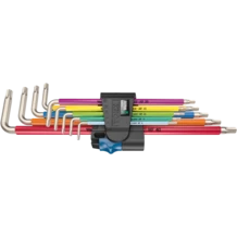 Set of high quality stainless steel L-keys for internal TORX® screws. Very corrosion-resistant due to ice-hardened stainless steel material of the L-key, avoiding the transmission of extraneous rust in stainless steel screw connections. With holding function on the long arm: The clamping force resulting from the surface pressure between the output tip and the screw profile holds the screws securely on the tool. With extra long arm for working in a low position. The grip-friendly hose jacket facilitates screwdriving even at low temperatures. Take it easy tool finder with colour coding by size. With a practical clip made of durable material for secure holding of the L-key while at the same time allowing easy removal.