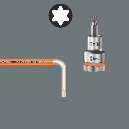 The HF tools developed by Wera are ideal because they feature an optimised geometry of the original TORX® profile. The wedging forces resulting from the surface pressure between the drive tip and the screw profile mean that TORX® screws made according to Acument Intellectual Properties specifications are securely held on the tool!