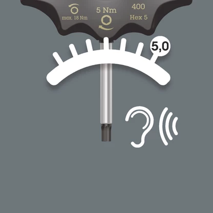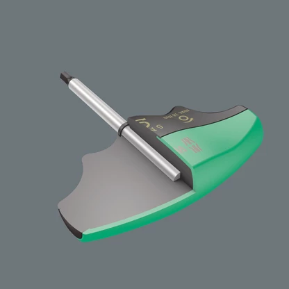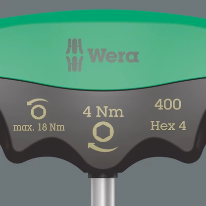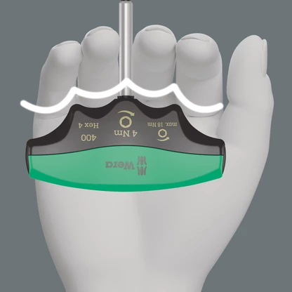 Wera torque indicator with fixed torque for hexagon sockets. Tamper proof. The robust slip clutch guarantees a clearly audible and tactile trigger signal when the set torque value is reached, and it is therefore impossible to apply any further torque. The loosening torque is significantly higher than the set tightening torque, therefore no additional tools are needed for loosening screw connections. The shape of the handle fills the whole hand well and the fingers lie in the softly rounded recessed grips. This ensures optimal, ergonomic power transmission.