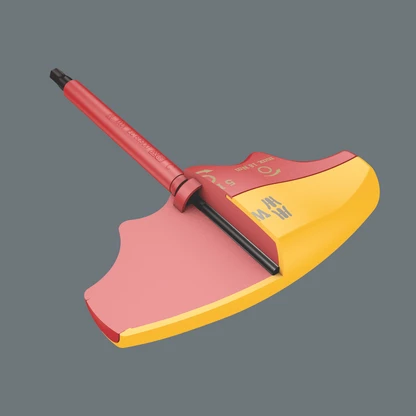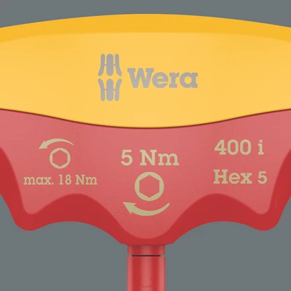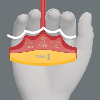Wera VDE torque indicator with fixed torque for hexagon socket screws. Tamper proof. The robust slip clutch generates a clearly audible and tactile trigger that signals when the set torque is reached, making it impossible to apply any further torque. The loosening torque value is significantly higher than the set tightening torque, therefore no additional tools are needed for loosening screw connections. The shape of the handle perfectly fills the whole hand and fingers comfortably lie in the softly rounded recessed grips. This ensures optimal, ergonomic power transfer. Individually tested tool as per IEC 60900 at 10,000 V for safe working at the approved voltage of 1,000 V.