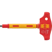 VDE-insulated T-handle with 1/4" square head mounting and integrated ball lock for attachment tools. The fine-toothed ratchet mechanism in the handle ensures fast, powerful and preice working. The recesses in the fast-rotating sleeve allow resistance to be generated by finger force. This allows the ratchet mechanism to be used even at low resistance of the screw. The shape of the T-handle allows the transmission of particularly high tightening and loosening moments. The geometry of the handle fills the whole hand well and the fingers lie firmly in the softly rounded handle notches. This ensures an optimal, ergonomic power transmission. Individually tested tools as per IEC 60900 at 10,000 V for safe working at the approved voltage of 1,000 V. For 1/4" VDE bit sockets and sockets from the Wera Zyklop VDE series 8740, 8760, 8767, 8790. The coated handle protects sensitive surfaces from damage.