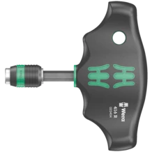 T-handle screwdriver: The ideal handle shape to allow high torque transmission in difficult tightening and loosening situations. The ergonomic shape of the handle fills the palm of the hand well, the fingers lie safely in the soft rounded handle recesses. The whole hand makes contact with the handle and friction losses between the hand and the handle are avoided. Bit holder for bits with 1/4" hexagon drive as per DIN ISO 1173-C 6.3 and E 6.3. With Rapidaptor technology for lightning-fast bit changes.