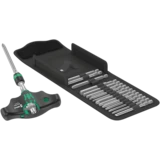 The integrated ratchet with fine toothing (80 teeth/return angle 4.5°) eases and accelerates screwdriving without having to reposition the tool. The ratchet mechanism completely embedded in the handle ensures very handy and comfortable work. With reversing lever for comfortable clockwise/counterclockwise direction change in one-hand operation. The ergonomic shape of the handle fills the ball of the hand well, the fingers lie securely in the softly rounded recessed grips. The whole hand comes into contact with the handle, friction loss between hand and handle is avoided. Bit holder for bits with 1/4" external hexagon drive as per DIN ISO 1173-C 6.3 and E 6.3. With Rapidaptor technology for lightning-fast bit changes.