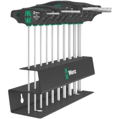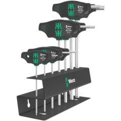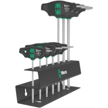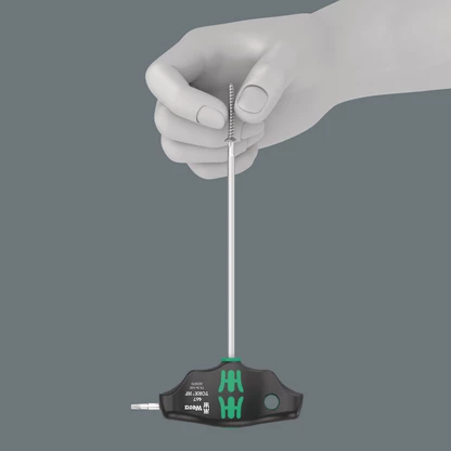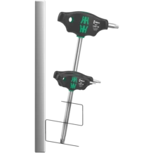 T-handle screwdriver: The ideal handle shape allows the transmission of particularly high tightening and loosening torque. The ergonomic shape of the handle fills the palm of the hand well, the fingers lie safely in the soft rounded handle recesses. The whole hand makes contact with the handle and friction losses between the hand and the handle are avoided. With holding function to securely hold the TORX® screw on the tool. Special surface treatment of the blades for high corrosion protection and optimum fitting accuracy in the screw. Including metal rack for storage. The rack can be placed on the workbench or hung on the tool wall.