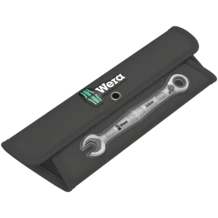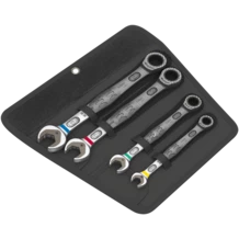 High quality combination ratchet wrench set by Wera: everything that a wrench has to be able to do. And a whole lot more. Faster, better, stylish. Yes, a real Joker. The new generation of combination ratchet wrenches. 4-piece set in a robust pouch. Suitable for hexagon bolt heads or nuts. Comes with a holding function, thanks to the metal plate in the jaw, which reduces the risk of dropping nuts and bolts. The replaceable metal plate in the jaw secures nuts and bolts with its extra hard teeth and limits the danger of slipping. The integrated limit stop prevents any slipping down around the bolt head and allows higher torque to be applied. The double-hex geometry makes for a positive connection with nuts or bolts and reduces the risk of slipping. A return angle of only 30° at the open end prevents any time consuming flipping of the wrench during fastening jobs. The ratchet mechanism at the ring end, with an exceptional, fine-tooth mechanism - 80 teeth in all - enables flexibility even in very confined working spaces. The specially forged geometry provides for high torque transfer and strength. Manufactured out of high performance chrome molybdenum steel with a nickel-chrome coating for high corrosion protection. Take it easy Tool Finder with colour coding according to sizes