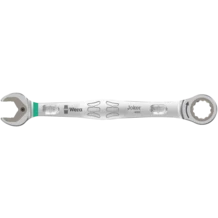 High quality, imperial, combination ratchet wrench by Wera. Everything that a wrench has to be able to do. And a whole lot more. Faster, better, stylish. Yes, a real Joker. The new generation of combination ratchet wrenches. Suitable for hexagon socket screws, bolts or nuts. Comes with holding function, thanks to the metal plate in the jaw, which reduces the risk of dropping nuts and bolts. The replaceable metal plate in the jaw secures nuts and bolts with its extra hard teeth and reduces the danger of slipping. The integrated limit stop prevents any slipping around the bolt head and allows higher torque to be applied. The double-hex geometry makes for a positive connection with nuts or bolts and reduces the risk of slipping. A return angle of only 30° at the open end prevents any time consuming flipping of the wrench. The ratchet mechanism at the ring end, with an exceptional, fine-tooth mechanism - 80 teeth in all - enables flexibility even in very confined working spaces. The specially forged geometry ensures high torque transfer and strength. The ratchet is manufactured out of high performance chrome molybdenum steel with nickel-chrome coating for high corrosion protection. Take it easy Tool Finder with colour coding according to sizes.