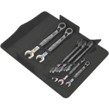 High quality set of ratcheting combination wrenches by Wera: Joker ratcheting combination wrenches with angled ratchet head and switch lever. The metal plate in the jaw provides for the holding function which reduces the risk of losing nuts and bolts. The integrated limit stop can prevent any slipping from the bolt head downwards and enables higher torque to be applied. The exchangeable metal plate in the jaw securely holds nuts and bolts with its extra hard teeth and reduces the risk of slipping. The double-hex geometry delivers a very positive connection with nuts or bolts and again provides for a lower risk of any slipping. The low return angle of only 30° at the jaw end avoids any time-consuming flipping of the wrench when fastening. The reversible ratchet mechanism at the ring end with its fine toothing (80 teeth) ensures great flexibility even in confined spaces. Audibly precise ratchet mechanism. Additionally, the robust two-piece locking element provides for an extreme stability. Comes with a 15° tilted ratchet end for secure work even at high torque. The special forged geometry allows for high torque transfer and high flexural rigidity. Manufactured out of high-performance chrome-molybdenum steel with a nickel-chromium coating for high corrosion protection. With Take it easy Tool Finder: colour coding according to size.