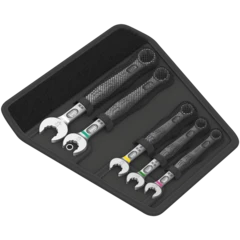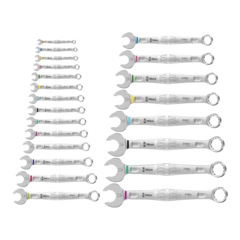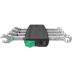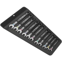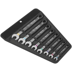 As installation spaces become increasingly confined, it remains necessary that tools enable users to work successfully. Narrow spaces require additional placement points of the tool, to allow screws to be accessed and actuated. Can spanners be modified so that the placement possibilities of the tool increase? The combination of the 7.5° offset open end and the double hexagon geometry doubles the placement points. A repeated 180° turn of the wrench around the longitudinal axis during screwdriving provides four placement possibilities, and bolts or screw heads can be "taken" every 15°. The Joker 6003 with its smart open end geometry significantly expands the range of uses in confined spaces. The Joker 6003 will automatically find the respective placement point after every turn. The slim yet robust ring side is tilted by 15° to the tool axis. The high-quality surface treatment achieves a high and long-lasting corrosion protection. With Take it easy tool finder: colour coding by size. The Joker pouches are suitable for attachment to walls, shelves, workshop trolleys and the Wera 2go system thanks to the hook and loop fastener system on the back.