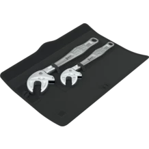 Many users wish to have a universal screwdriving tool with the widest possible range of applications. It should be a single tool for multiple metric and imperial dimensions. It should automatically adjust to the different screw sizes. It should be safe to grab without damaging anything and should allow for high working speeds. With its continuous and parallel jaws the Joker 6004 replaces several single spanner sizes. The required size is automatically and continuously set when attaching the tool to the hexagon bolt or screw. The integrated lever mechanism securely clamps the hexagon screw or bolt between the jaws, which significantly reduces the risk of slippage or damage. The ratchet feature ensures fast and consistent screwdriving without removing the tool. By using the corner-width rectangular prisms, a return angle of only 30° can be achieved. The single-arm design, in conjunction with the ratchet feature and the corner-width prism, makes it possible to work even in confined spaces. The adjustable Joker 6004 is the universal screwdriving tool. Self-setting. Gripping. Spanning. 2-piece set for at least 9 different metric and imperial screw drives, comes in a compact folding pouch. The Joker pouches are suitable for attachment to walls, shelves, workshop trolleys and the Wera 2go system thanks to the hook and loop fastener system on the back.