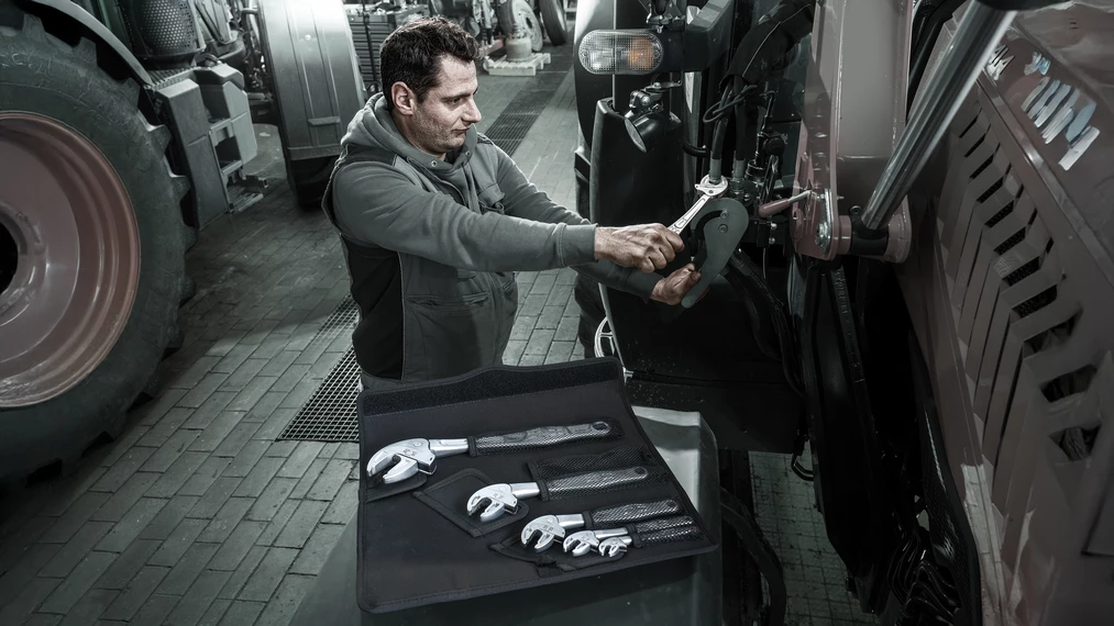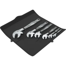 6-piece set. Joker 6004 self-setting spanners with ratchet functionality. With its continuous and parallel jaws, the tool replaces several single wrench sizes. For metric (7.0 to 32.0 mm) and imperial (¼" to 1 1/4") hexagon screws and bolts. The required size is automatically and continuously set when attaching the tool to the hexagon bolt or screw. The integrated lever mechanism securely clamps the hexagon screw or bolt between the jaws, which significantly reduces the risk of slippage or damage. The ratchet feature ensures fast and consistent screwdriving without removing the tool. By using the corner-width rectangular prisms, a return angle of only 30° can be achieved. The single-arm design, in conjunction with the ratchet feature and the corner-width prism, makes it possible to work even in confined spaces. In a robust roll pouch.