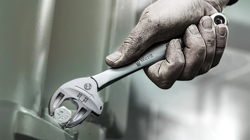 Many users wish to have a universal screwdriving tool with the widest possible range of applications. It should be a single tool for multiple metric and imperial dimensions. It should automatically adjust to the different screw sizes. It should be safe to grab without damaging anything and should allow for high working speeds. With its continuous and parallel jaws the Joker 6004 replaces several single spanner sizes. The required size is automatically and continuously set when attaching the tool to the hexagon bolt or screw. The integrated lever mechanism securely clamps the hexagon screw or bolt between the jaws, which significantly reduces the risk of slippage or damage. The ratchet feature ensures fast and consistent screwdriving without removing the tool. By using the corner-width rectangular prisms, a back-pivoting angle of only 30° can be achieved. The single-arm design, in conjunction with the ratchet feature and the corner-width prism, makes it possible to work even in confined spaces. The adjustable Joker 6004 is the universal screwdriving tool. Self-setting. Gripping. Spanning.
