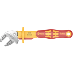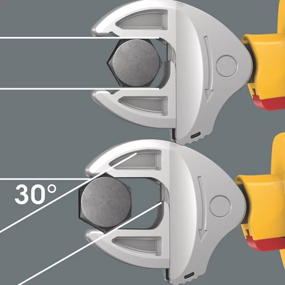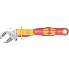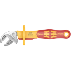 Individually tested tools as per IEC 60900 at 10,000 V for safe working at the approved voltage of 1,000 V. The adjustable VDE spanner continuously and automatically grips all hexagonal sizes in the indicated range of dimensions - metric and imperial. The integrated lever mechanism securely clamps the hexagon screw or bolt between the jaws, which significantly reduces the risk of slippage or damage. The ratchet feature ensures fast and consistent screwdriving without removing the tool. By using the corner-width rectangular prisms, a return angle of only 30° can be achieved. The single-arm design, in conjunction with the ratchet feature and the corner-width prism, makes it possible to work even in confined spaces. The adjustable Joker 6004 VDE has a naturally comfortable handle thanks to the 2-component plastic insulation. Safety is increased by the anti-slip protection at the front end of the handle. The sliding function offers contactless and safe opening of the non-insulated jaws, thereby providing extra protection.