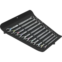 11-piece ratcheting combination spanner set. Brilliant combination of jaw end and ratchet mechanism at the ring end in a long design. For hexagon screw heads and bolts. The long lever allows for higher power transmission. The long design also improves accessibility at low-lying couplings. With holding function enabled by a metal plate in the mouth, which reduces the risk of losing screws and sockets. With its extra hard teeth, the exchangeable metal plate in the mouth secures screws and sockets and reduces the risk of slipping. The integrated end stop can prevent the screw head from slipping down and allows application of high torque transfer. The double hexagon geometry ensures a positive connection with the screw or bolt and thus reduces the risk of slipping. A return angle of only 30° at the jaw end avoids time-consuming rotating of the tool whilst screwdriving. Ratchet mechanism at the ring side with exceptionally high fine toothing of 80 teeth for flexibility even in confined spaces. The specially engineered geometry allows high torque transmission and high bending stiffness. Made of high-performance chromium molybdenum steel with nickel-chromium coating for high corrosion protection. With Take it easy tool finder: colour coding by size and extra laser-engraved size indication. In a robust roll pouch for easy transport and clean storage. 2 loops to hang up the roll pouch when closed or open.