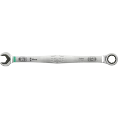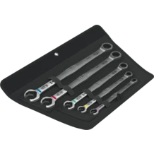 5-piece ring ratchet spanner set. Unique combination of jaw and ring ratchet mechanism in a long design. For hexagon screw heads and bolts. The long lever allows for higher power transmission. The long design also improves accessibility at low-lying couplings. With holding function enabled by a metal plate in the mouth, which reduces the risk of losing screws and sockets. With its extra hard teeth, the exchangeable metal plate in the mouth secures screws and sockets and reduces the risk of slipping. The integrated end stop can prevent the screw head from slipping down and allows application of high torques. The double hexagon geometry ensures a positive connection with the screw or bolt and thus reduces the risk of slipping. A return angle of only 30° at the jaw end avoids time-consuming rotating of the tool whilst screwdriving. Ratchet mechanism at the ring side with exceptionally high fine toothing of 80 teeth for flexibility even in confined spaces. The specially engineered geometry allows high torque transmission and high bending stiffness. Made of high-performance chromium molybdenum steel with nickel-chromium coating for high corrosion protection. With Take it easy tool finder: colour coding by size and extra laser-engraved size indication. In a robust roll pouch for easy transport and clean storage.