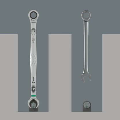 Unique combination of jaw and ring ratchet mechanism in a long design. The long lever allows for higher power transmission. The long design also improves accessibility at low-lying couplings.