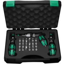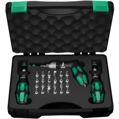 Wera torque screwdriver set. Two high precision torque screwdrivers with variable torque settings. One torque screwdriver with Kraftform pistol handle for the transfer of especially high torque; multi-component for high working speeds and particularly ergonomic screwdriving. Simple adjustment of the required torque value without any special tools. Easy-to-read scale value. Rapidaptor quick-release technology for rapid bit change. Unlimited torque to loosen seized screws. Multi-component Kraftform handle with hard and soft zones for high working speeds, whilst being easy on the hand. Includes a bit assortment in a high quality and stable plastic case.