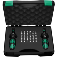 Wera torque screwdriver set. Two torque screwdrivers with variable torque setting option with highest precision. Simple adjustment of the required torque value without any special tools. Easy-to-read scale value. Rapidaptor quick-release technology for rapid bit change. Unlimited torque to loosen seized screws. Multi-component Kraftform handle with hard and soft zones for high working speeds, whilst being easy on the hand. Includes bit assortment in a high quality and stable plastic case.