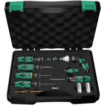 12-piece tool set for the proper assembly and disassembly of tyre pressure control systems. Comes with torque technology for controlled screw tightening. Hand tool with multi-component Kraftform handle for high working speeds and ergonomic working. Five pre-set tools to connect the union nut with the screw and to fasten the sensor component to the valve. Two pre-set valve insertion tools with 0.25 and 0.45 Nm. An adjustable Kraftform pistol handle for torque values of between 4.0 and 8.8 Nm. Suitable for all customary tyre pressure control systems. Dependable fastening thanks to distinctly coloured marking of the pre-set torque values (Beru/Huf®: TX 10 yellow 1.25 Nm; Schrader®: TX 10 green 1.4 Nm; Cup®/RTS®: TX 20 grey 2.0 Nm). Two TX bits with holding function, socket adaptor, two sockets plus a valve dolly (for applications up to 4.5 Nm). Suitable for tyre control, systems from e.g. Schrader®, Alligator®, VDO®. The pre-set torque screwdriver fixed at 3.3 Nm actuates both the union nut as well as the connecting screw on the sensors of the Alligator system. Additionally included: socket adaptor, two bits, valve dolly (for applications up to 4.5 Nm).