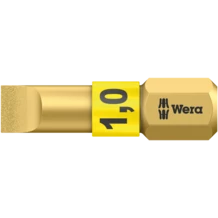 Bits for slotted screws with tiny diamond particles on the bit tip. This ensures a secure fit of the bit in the screw, reduces the contact pressure required and lowers the risk of slipping. Comes with Torsion zone where kinetic energy is diverted from peak loads. This greatly extends the product service life; ¼" hexagon, suitable for holders as per DIN ISO 1173-D 6.3.