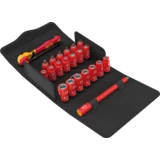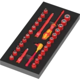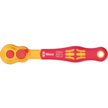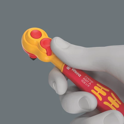 1/4" Zyklop VDE ratchet for the most common VDE couplings in electrical building installations. Reversing lever for easy clockwise/counterclockwise change. Suitable for working even in very confined spaces, thanks to the slim design and the low return angle (4.5°). Reliable socket locking, activated via push-button. Safe working at voltages up to 1,000 V is guaranteed as each tool is tested at 10,000 V as per IEC 60900.