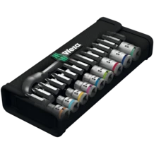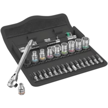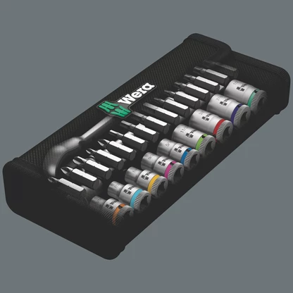 Incredibly compact set arrangement with many tools in a minimum of space. A completely new ratchet set feeling thanks to the unique textile boxes that are very robust and durable. They can be positioned upright for tidy storage on the workshop shelf. Additional surface protection due to textile outer material. Low weight and volume for simpler mobility. Take it easy Tool Finder with colour coding according to sizes.