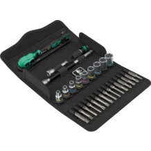 28-piece ratchet set, 1/4", sockets in metric sizes. One Zyklop Comfort ratchet with reversing lever, fine-toothed with 80 teeth, low return angle of only 4.5°; 9 Zyklop sockets with Take it easy tool finder: colour coding by size and extra laser-engraved size indication to find the required tool quickly; one Zyklop extension (150 mm long) with fast-rotating sleeve for fast "spinning", one Wobble extension with pivoting angle of 15° in all directions, one bit adapter (1/4" square head socket to 1/4" hexagonal socket), 15 bits, tough for universal use. One robust textile box, compact design for space-saving tool storage; the firm and light material of the textile box lowers the weight of the set - ideal for mobile use.