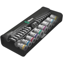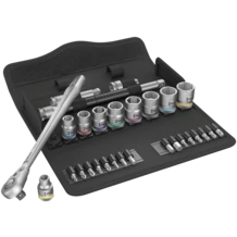Incredibly compact set arrangement with many tools in a minimum of space. A completely new ratchet set feeling thanks to the unique textile boxes that are very robust and durable. They can be positioned upright for tidy storage on the workshop shelf. Additional surface protection due to textile outer material. Low weight and volume for simpler mobility. Take it easy Tool Finder with colour coding according to sizes.