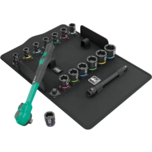 16-piece Zyklop Comfort ratchet set in a light and robust, durable textile box. The 2-component plastic sleeve of the Zyklop Comfort ratchet makes working comfortable even in the cold and at the same time protects surfaces against damage. The Zyklop Impaktor sockets stand out with higher-than-average service life even at extreme requirements. The required size is easily accessible due to the Take it easy Tool finder (colour coding by size). The Zyklop extension also makes it easy to operate hard-to-reach screws and bolts.